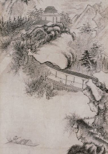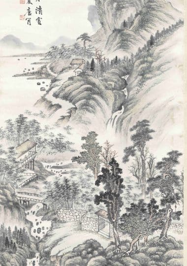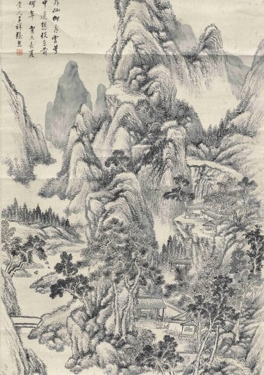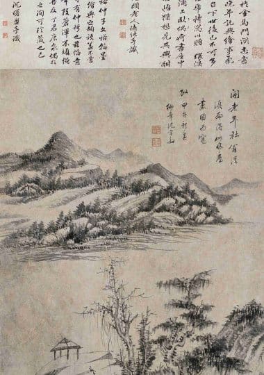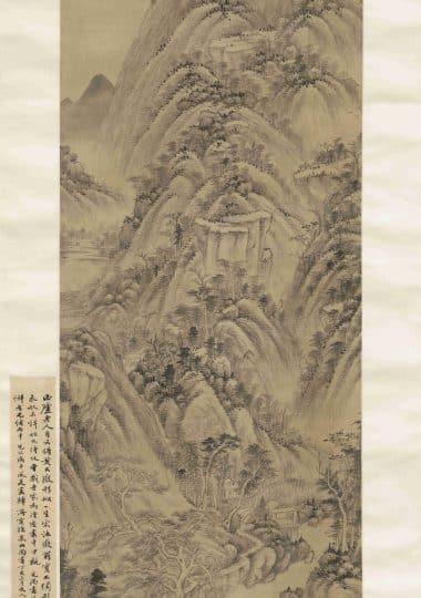 An Ink Landscape created for Yongshu’s Birthday (Attributed to Wang Jian by Xu Bangda)《为永叔寿作墨笔山水轴 (徐邦达考为王鉴代笔)》