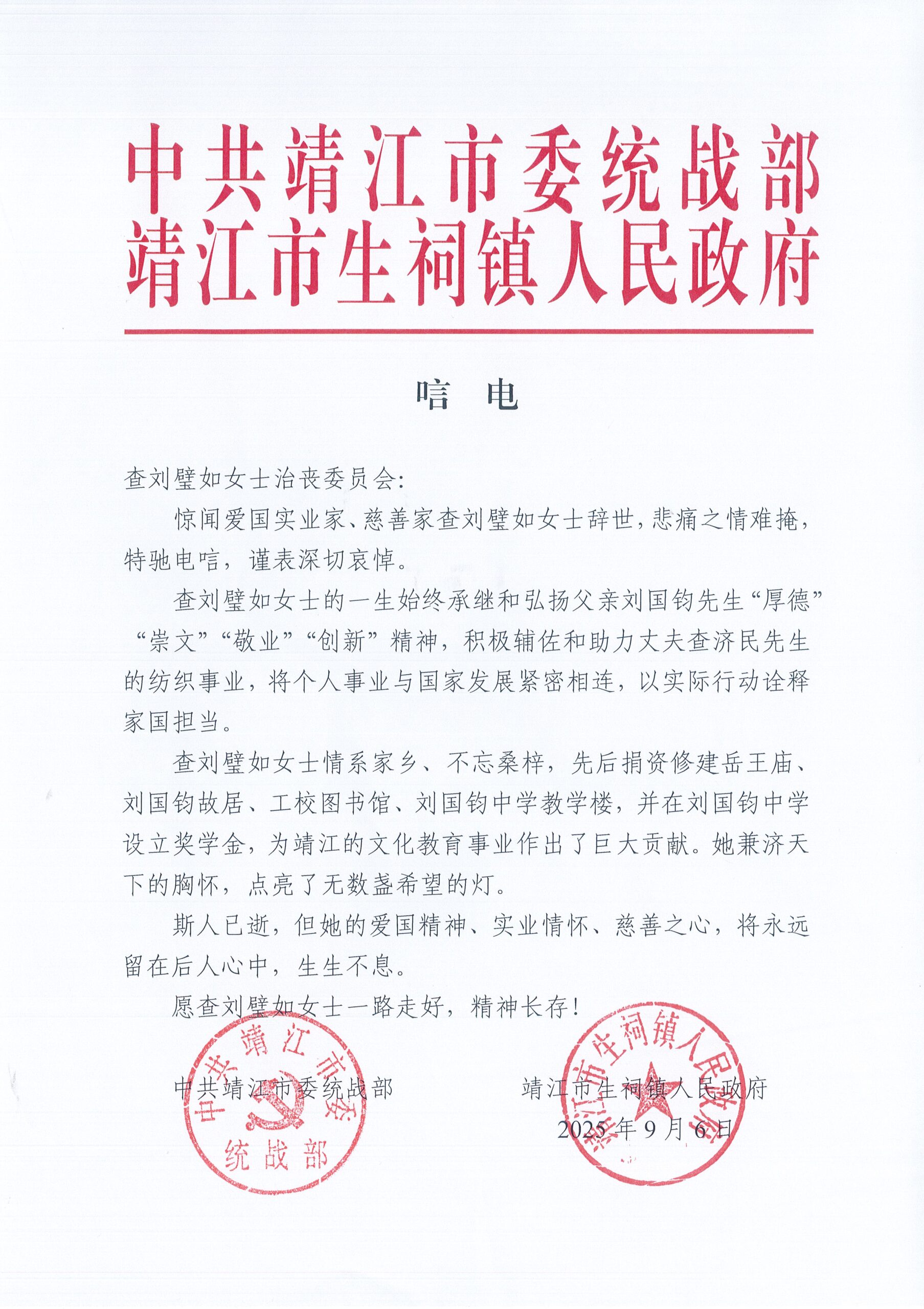 Condolence letters from the CPC Changzhou Municipal Committee and the CPC Jingjiang Municipal United Front Work Department, together with the Shengci Town People’s Government, mourn the passing of Ms. Liu Biru.