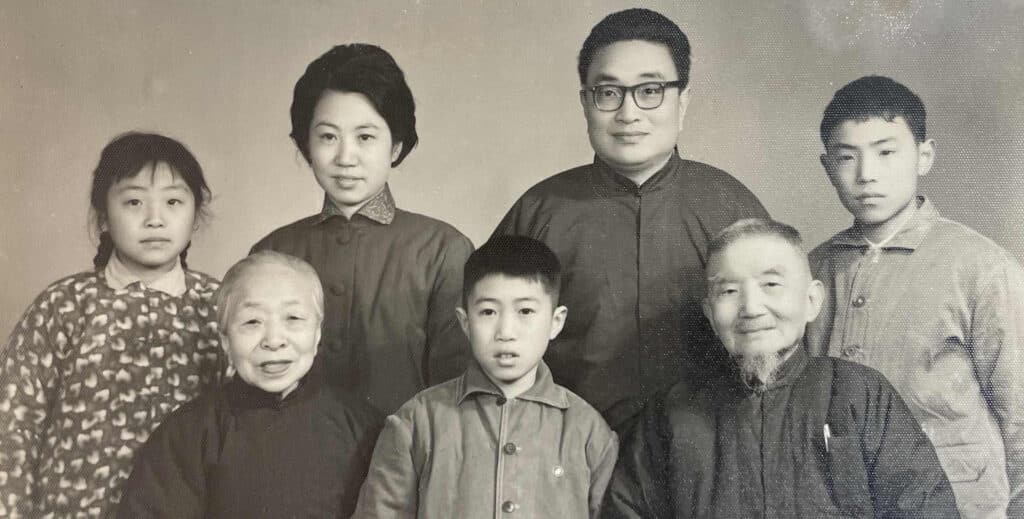 A family portrait featuring Liu Guojun and his wife, Chu Sue, seated in the front. Behind them is their youngest son, Liu Hanliang, surrounded by his own family – his wife, Wang Tsuifeng, stands next to him, while his eldest son, Jack Liu, occupies the back right, his daughter, Nancy Liu, on the back left, and the youngest son, James Liu, in the front middle.