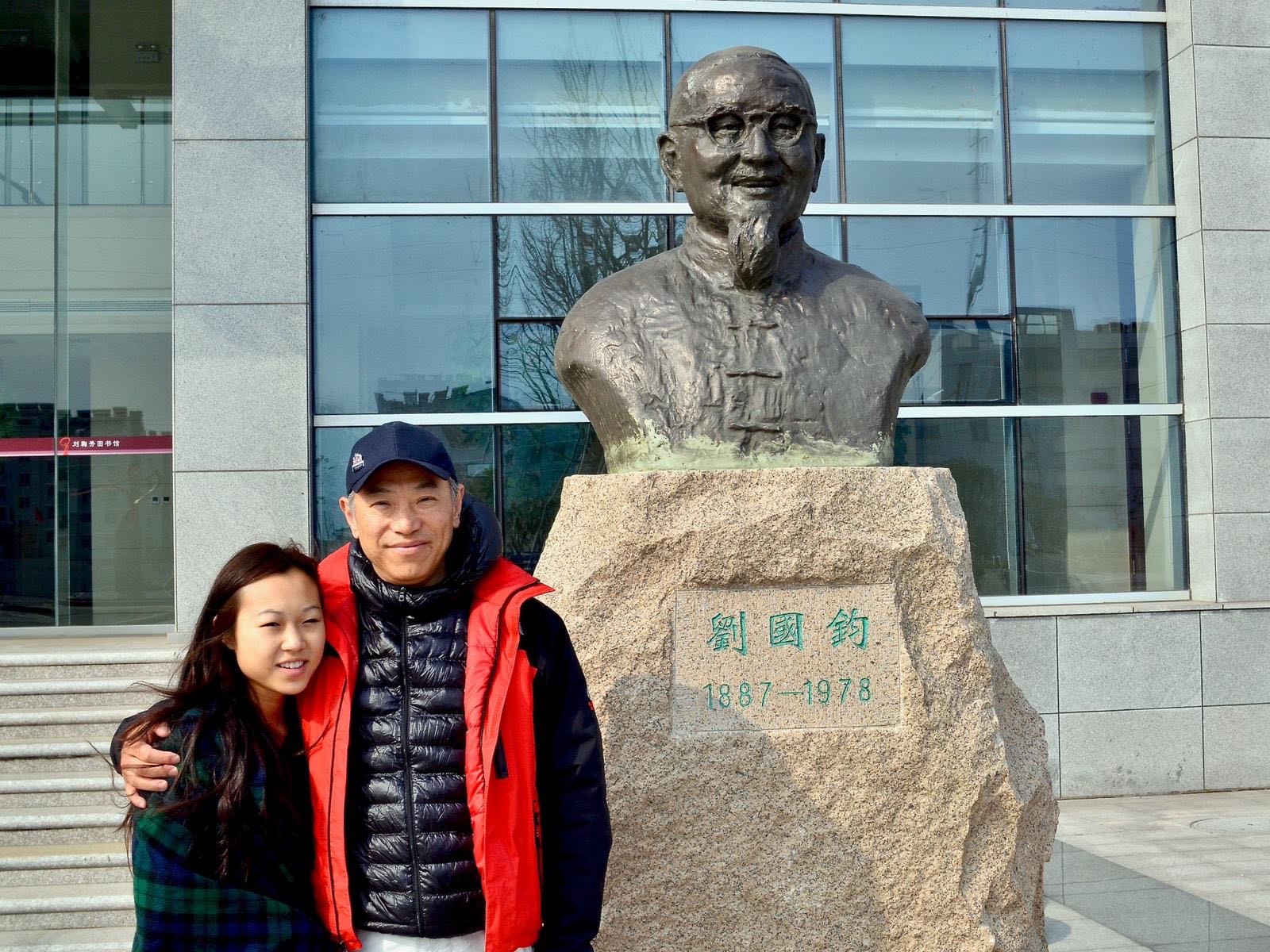 Jack Liu with his daughter, Janet Liu in front of Liu Guojun’s monument at the Liu Guojun Vocational School in Changzhou
