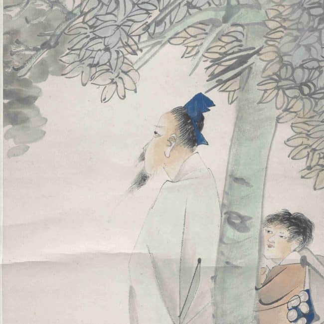 This painting features smooth lines and swift brushwork, using his typical decorative "nail-head and rat-tail" strokes to express the figure's detached demeanor through their eyes and posture. It is considered a representative work of Ren Bonian's figure paintings. The inscription reads: "Under the Shade of the Parasol Tree, summer of the Yiyou year of the Guangxu reign (1885), by Ren Yi from Shanyin." Below the inscription is a white seal with "Ren Bonian," and at the lower left of the painting is a red seal with "Yinxin Stone." Additionally, the lower left corner of the painting bears a red seal with "Fu Zhai Zhen Shang" as a collector's mark.