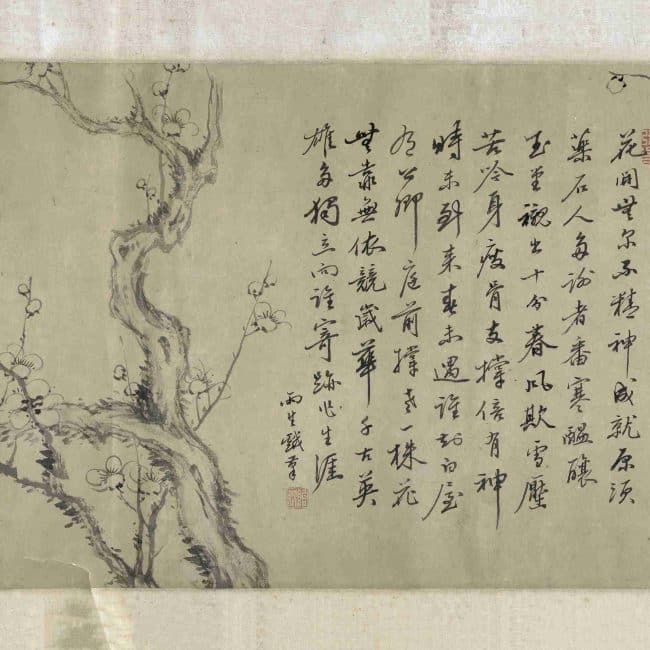 This scroll of ink plum blossoms follows the brushwork of Yuan dynasty artist Wang Mian and Qing dynasty artist Jin Nong, characterized by its delicate elegance, slender and graceful branches, and a sense of sparse shadows and cold fragrance. The brushstrokes are relaxed and free, capturing the essence of literati painting.