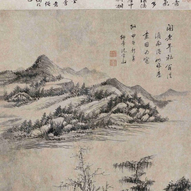 This painting's composition draws inspiration from Ni Zan's "One River Two Banks" style, with brushwork influenced by Huang Gongwang, achieving an ancient and plain elegance. The paper used was a gift from the recipient, made of Dian Nan bark paper, which differs from Shen's usual semi-mature Xuan paper. This difference imparts a unique rustic charm to the painting. The inscription at the upper right reads: "This paper was obtained from Dian Nan by Mr. Kai of the Old Men's Society, who asked me to paint on it as an expression of his feelings. New Spring of the Jiawu year, by Shifeng Shen Zongjing." The seals read "Shen Zongjing Yin" and "Nanji Shi," with the collector's seal "Xian Zeng Zhen Wan" at the lower right.