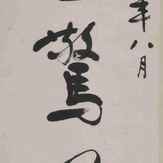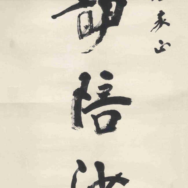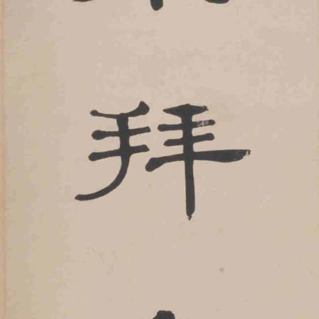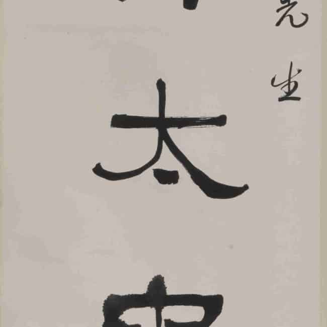 Xu Beihong studied under Kang Youwei, and his calligraphy was greatly influenced by Kang. However, he did not merely imitate Kang’s appearance but rather embraced Kang’s calligraphic philosophy, adhering to the stele school. Through extensive study, he developed his distinctive style. His calligraphy was both robust and graceful, possessing the monumental quality of the stele school while maintaining the elegance of the copybook school. This couplet is one of his large-character works, with strong and vigorous brushstrokes, penetrating the paper deeply, and the heavy ink exuding a sense of solid and unadorned beauty.