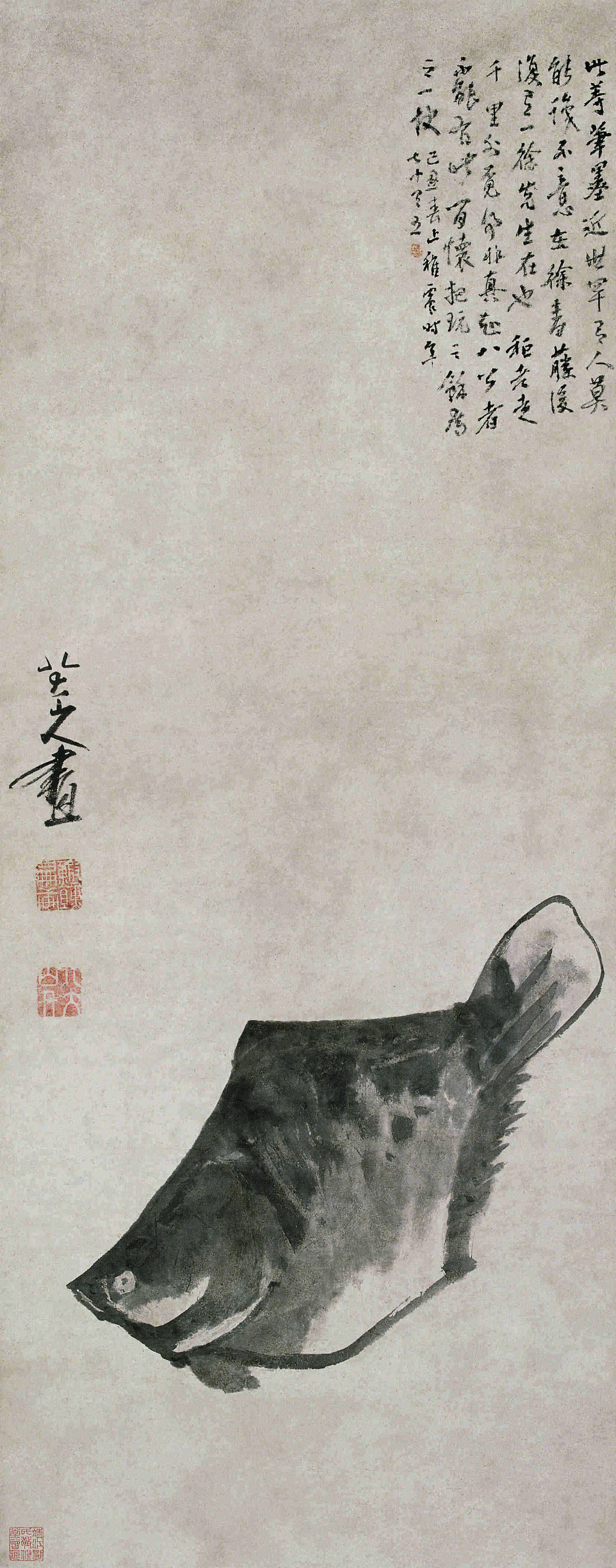 The inscription, “Painting of Bada Shanren,” is accompanied by two seals: one reading “鰰组Pianxuan” and the other “Bada Shanren.” The painting’s fusion of subtle humor, profound symbolism, and minimalist artistry makes it a quintessential representation of Zhu Da’s legacy.
