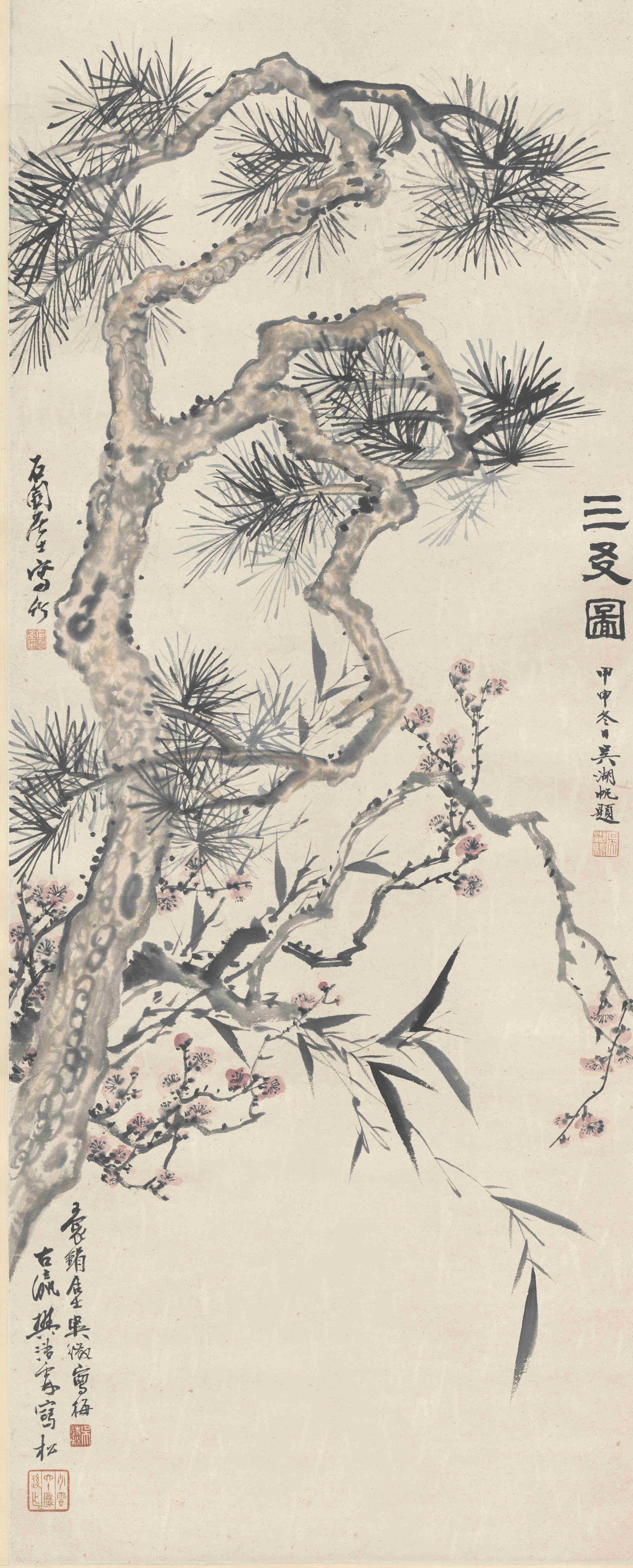 此轴为近现代名家合作花卉,画右方有吴湖帆题名署款:“三友图,甲申冬日吴湖帆题。”钤“吴湖帆”印。图中樊少云绘松树,沧桑虬劲;张玄绘修竹,姿态秀逸;吴待秋绘红梅,冷香四溢,虽未合绘但并无违和感,整幅画透出浓郁的文人气息。
