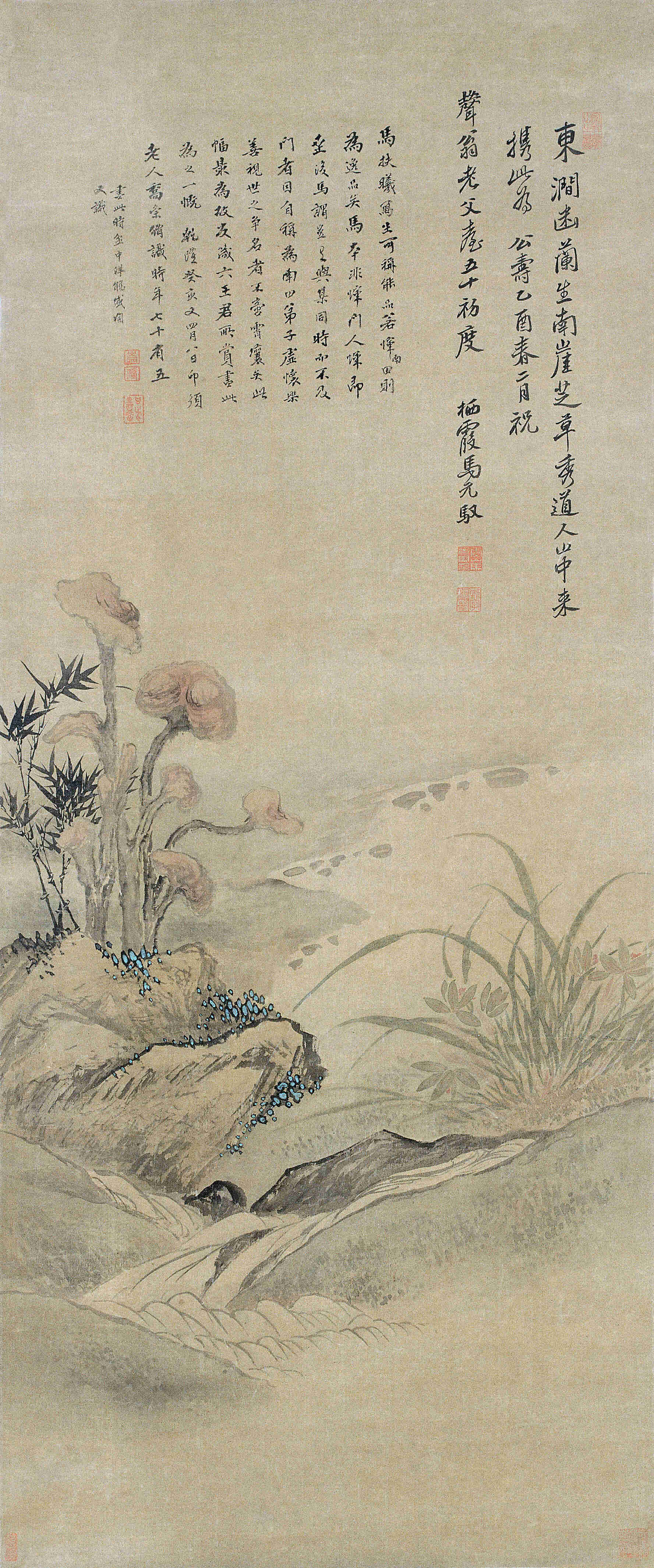“Orchids grow in the east stream, and the grass on the south cliff is beautiful. The Taoist came from the mountain and brought this to celebrate his longevity. I wish the old father Shengweng his fiftieth birthday.”