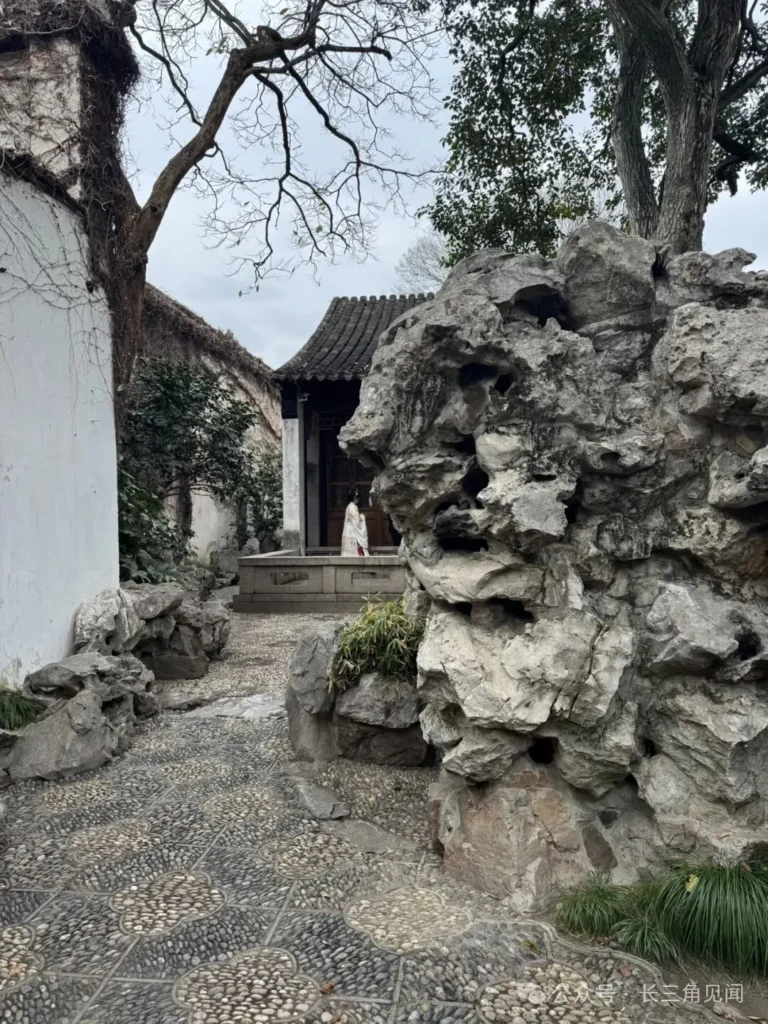 The West Garden showcases the combination of Suzhou‑style rockery landscaping and winding paths. In the foreground stand jagged Taihu rocks, with rugged textures and interlaced holes, exemplifying the Jiangnan garden aesthetic of “slender, wrinkled, perforated, and translucent.” Behind them lies a pebble‑paved winding path, accompanied by whitewashed walls, ancient trees, and distant pavilions, creating the poetic atmosphere of “a winding path leading to seclusion.”
