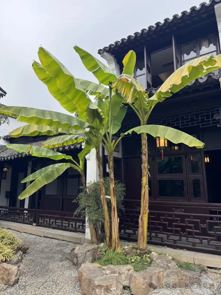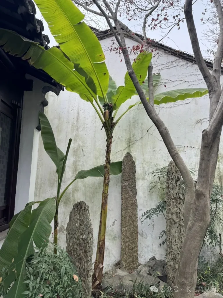 Within Ou Garden, the landscaping of banana plants and stone bamboo creates a tranquil scene. Banana plants are a common ornamental feature in Jiangnan gardens, while the stone bamboo set against white walls enhances the serene and elegant atmosphere of the garden.