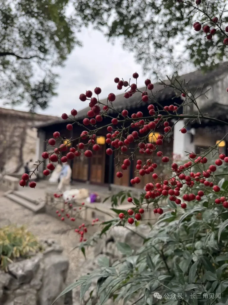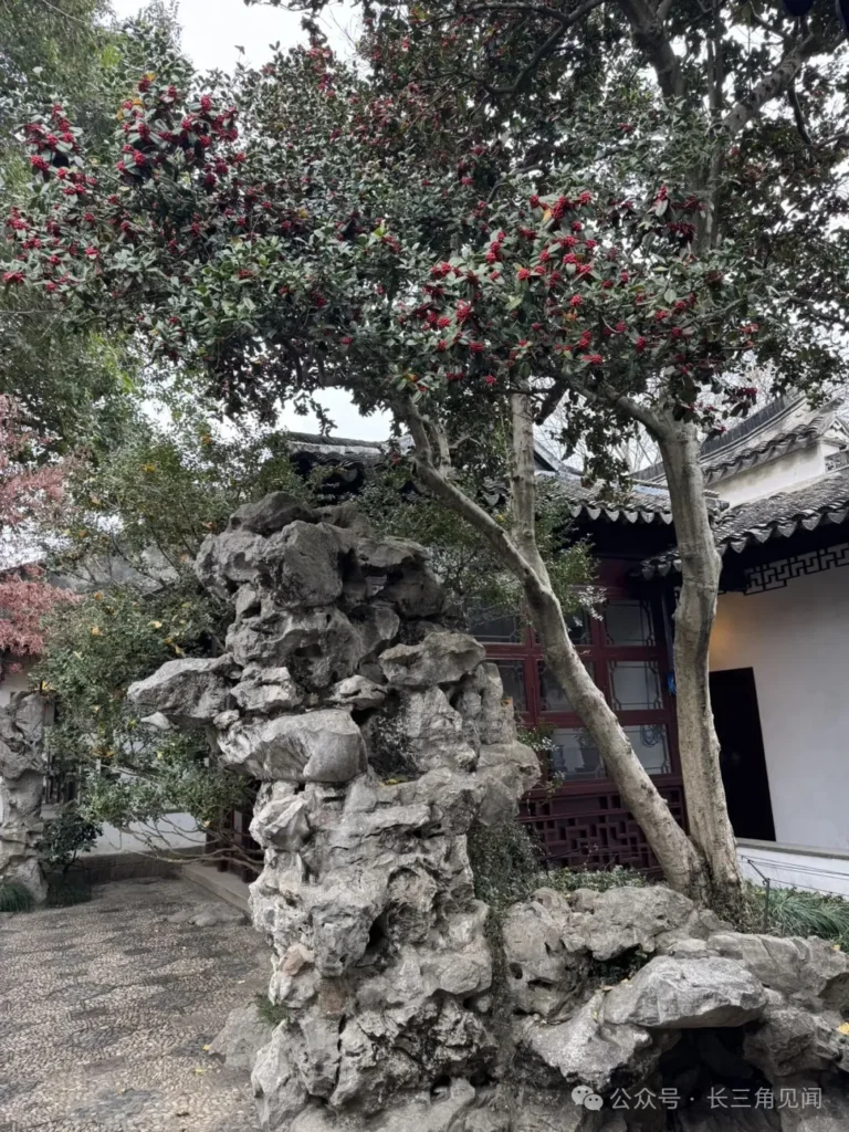 In the West Garden of Ou Garden, the holly tree is a signature fruit‑bearing plant of winter. Its red berries paired with evergreen foliage contrast beautifully with the whitewashed walls, dark roof tiles, and Taihu rockeries, creating an elegant vitality that characterizes Jiangnan gardens in the winter season.