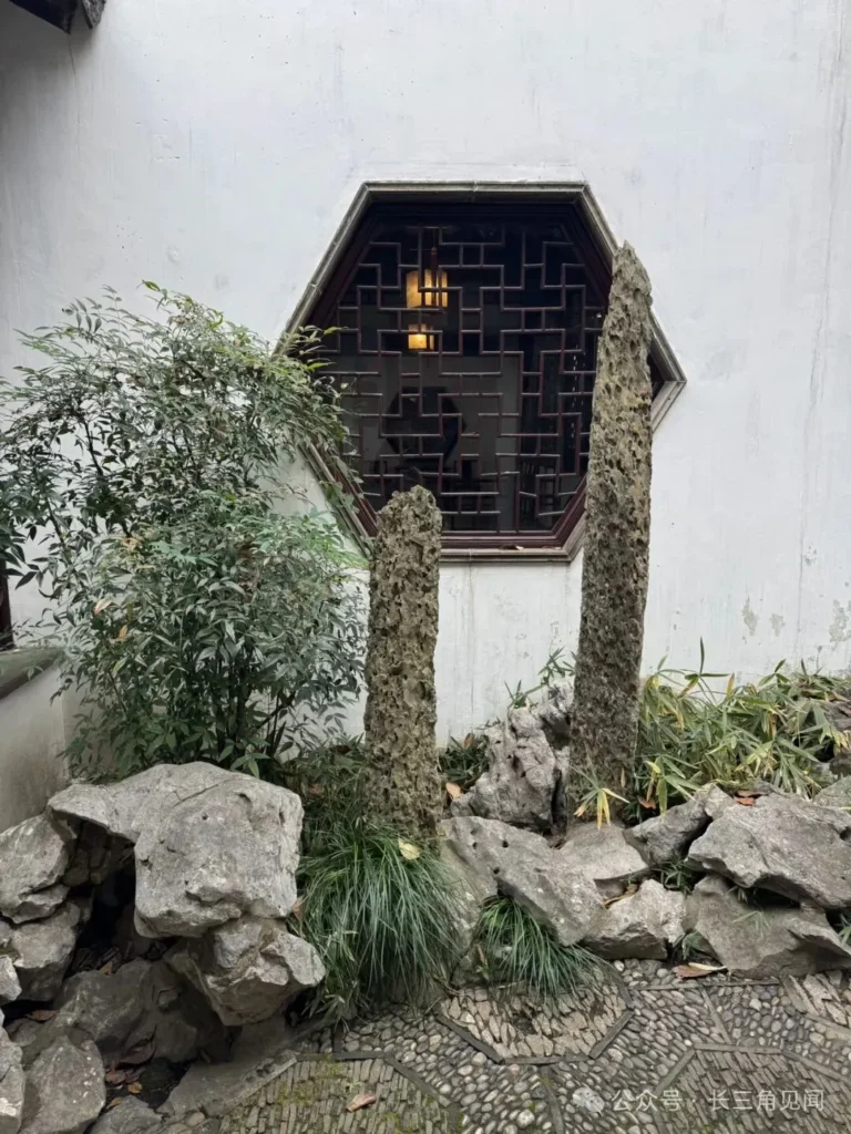 Ou Garden features an octagonal wooden lattice window decorated with an ice‑crack motif. Paired with Taihu rocks, stone bamboo, and bamboo groves, it exemplifies the Jiangnan garden technique of “framing the view,” where architectural elements are used to highlight and compose natural scenery.