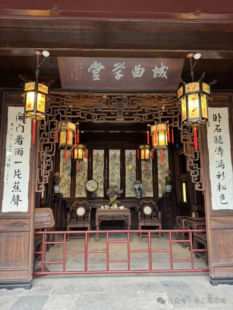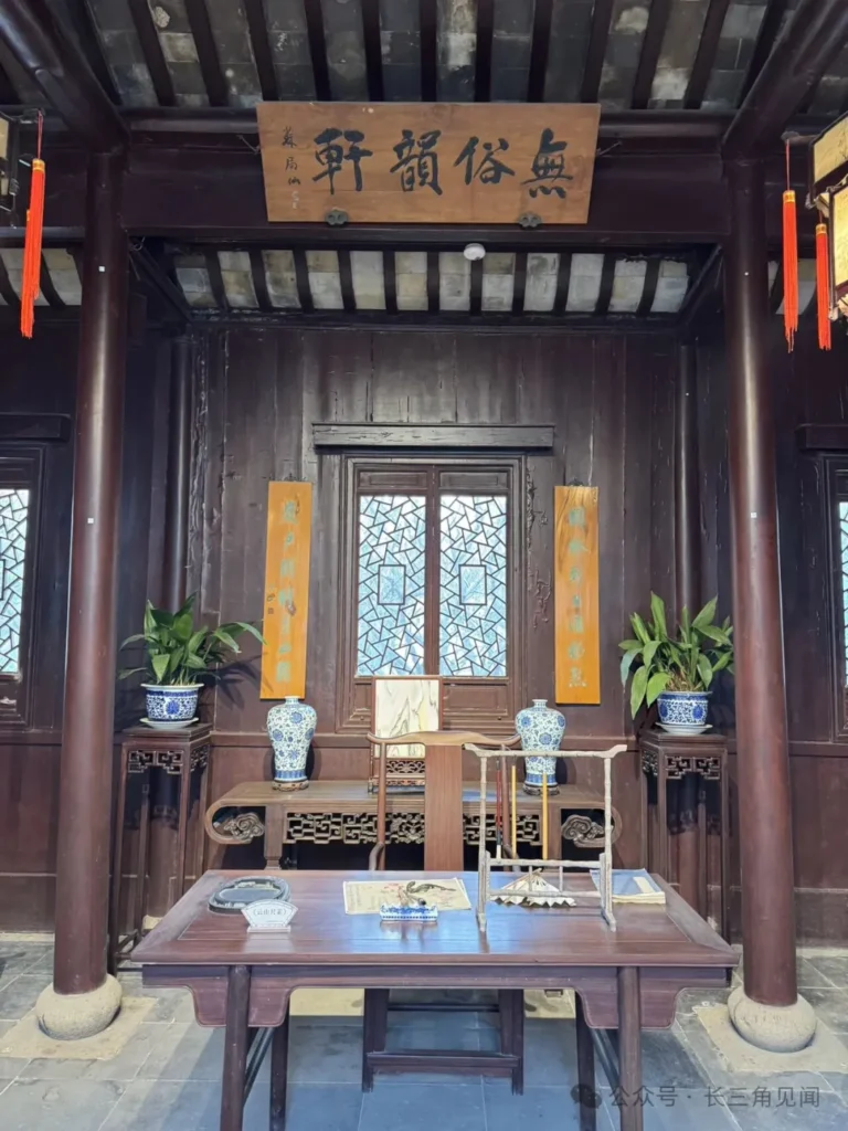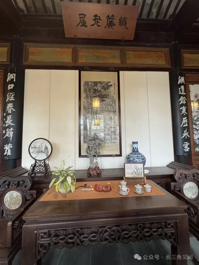The Wu Su Yun Pavilion in Ou Garden was a place for literati gatherings, appreciating scenery, and enjoying tea. The name “Wu Su Yun” conveys the idea of distancing oneself from worldly noise while preserving the integrity of the scholar’s spirit. Inside, the furnishings are simple and rustic, accented with blue‑and‑white porcelain and greenery. Through its windows, one borrows views of rocks, bamboo, and trees from the garden, making it a serene retreat where the owner and friends once discussed poetry and painting.