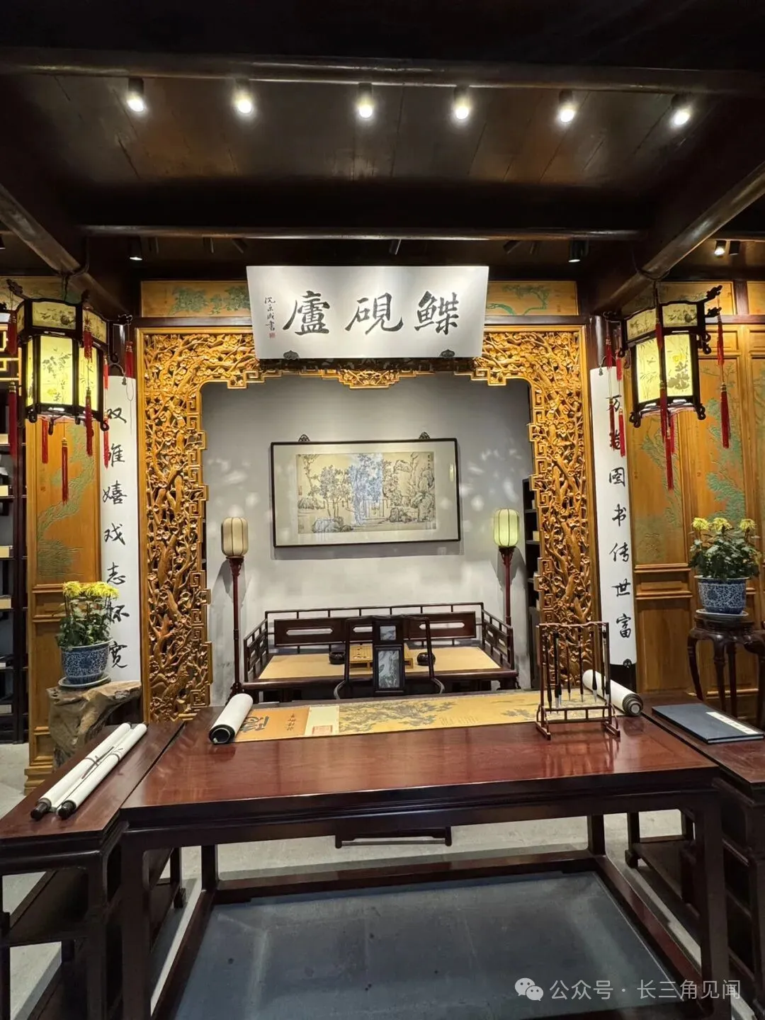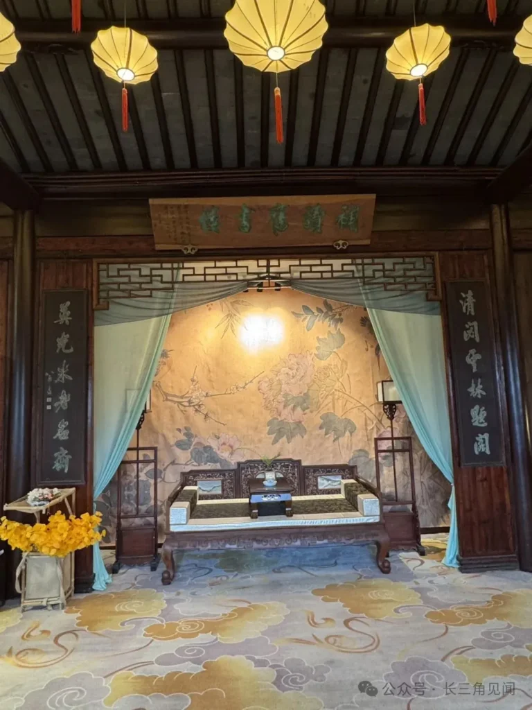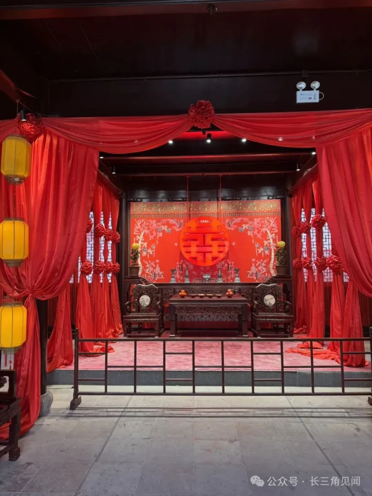 The main scene uses red as the dominant color, with “double happiness” characters, red drapery, and yellow lanterns. The central rosewood carved furniture reflects Suzhou craftsmanship, restoring the wedding setting of wealthy families.