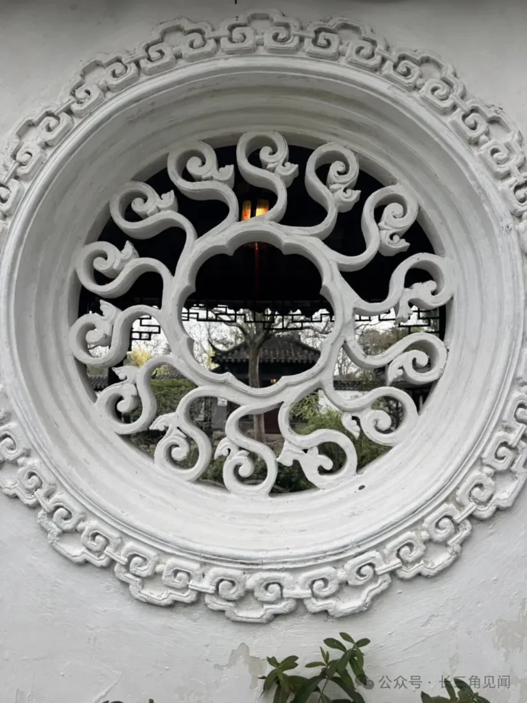 The circular carved stone window features floral and scrolling grass motifs. It is a typical leak window design in Suzhou gardens, serving both practical ventilation and ornamental landscaping purposes.