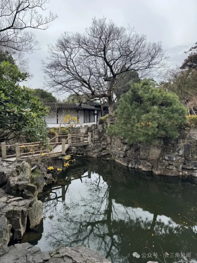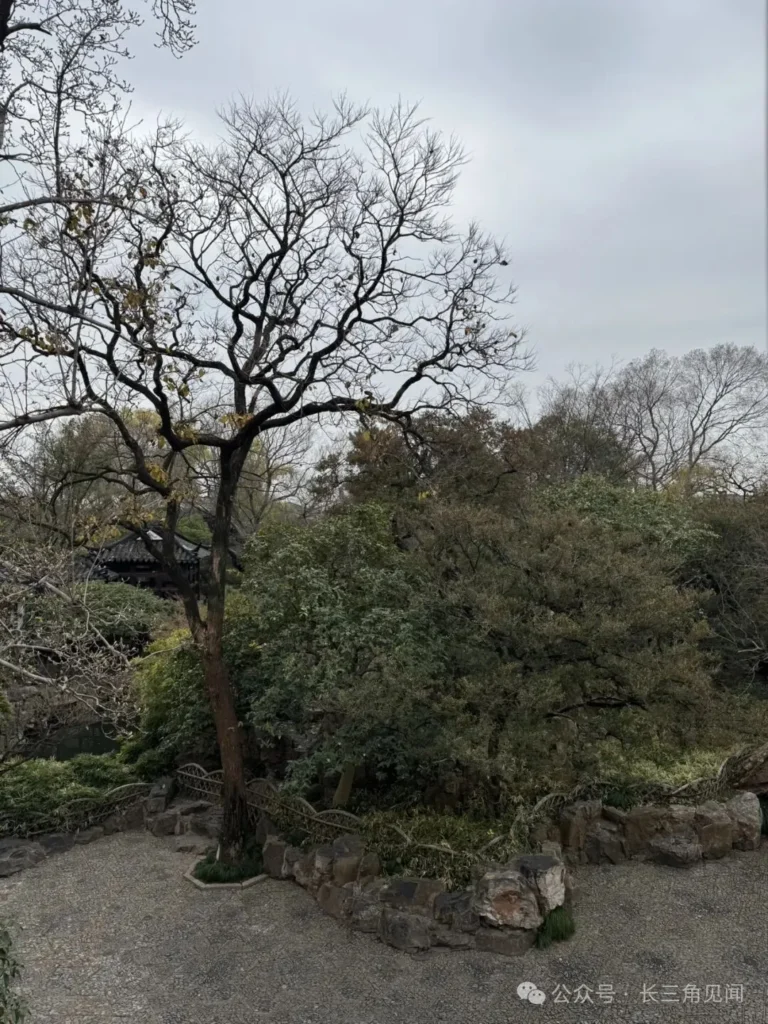 The gnarled branches of withered trees contrast with evergreen pines and holly, creating a seasonal interplay. Even in autumn and winter, the scene retains a sparse yet painterly quality, echoing Ou Garden’s tranquil theme of “seclusion at the city’s edge.”
