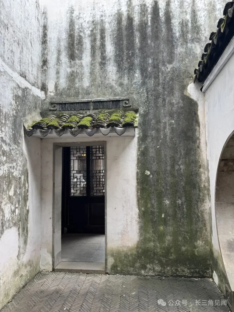 In the West Garden of Ou Garden, a small doorway is set against mottled white walls. The walls, eroded by time, bear ink‑like stains of varying depth. Moss‑covered green tiles rest on the lintel, paired with dark wooden lattice windows, forming a classic expression of Jiangnan architecture known as “whitewashed walls and black tiles.”