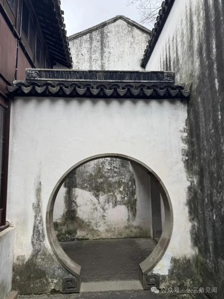 This weathered wall texture reflects the humid climate of Jiangnan while evoking an ancient sense of time. The framing effect of the doorway makes the inner space appear half‑hidden, adding to the garden’s subtle and restrained beauty.