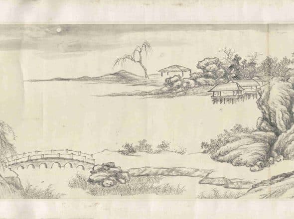 This painting portrays a tranquil and sparsely elegant landscape, embodying the poetic charm and spiritual resonance of Wang Yuanqi and Dong Bangda. The painting is noted for its refined composition and serene aesthetic. It bears the Qianlong Emperor's collection seal and inscriptions, indicating its inclusion in The Precious Collection of the Stone Moat Pavilion and its origins as an imperial collection. The inscription reads: "Respectfully painted by the subject Qian Weicheng," with two accompanying seals: a white seal "Subject Qian Weicheng" and a red seal "Respectful Service."