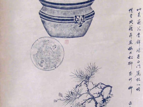 This painting by Tang Yifen on a full-shape rubbing of bronzes represents a new painting style that became popular in the late Qing and Republican periods. Full-shape rubbing, also known as "three-dimensional rubbing," is a special technique that transfers the original appearance of an object onto flat rubbing paper, requiring great skill. The three bronze items in the painting are carefully arranged, with the ink wash of the pine, plum, and background stones applied lightly, harmonizing with the rubbing and creating a sense of ancient charm. The only color used is the light red of the plum blossoms, which serves as a focal point to avoid monotony. This work showcases the artist's ingenuity. The inscription reads: "These are items from my collection. Li Jinhong passed by Baimen and asked me to make rubbings as a gift for Kaitang's library, and I painted plums, stones, and pines to complement them. Early winter of the Jiyou year, inscribed by Yifen while ill." The seals read "Tang Yifen's seal" and "Li Jinhong of Yanghu personally made this rubbing." The collector's seal reads "Once in the collection of Liu's Jingxiutang of Jingjiang."