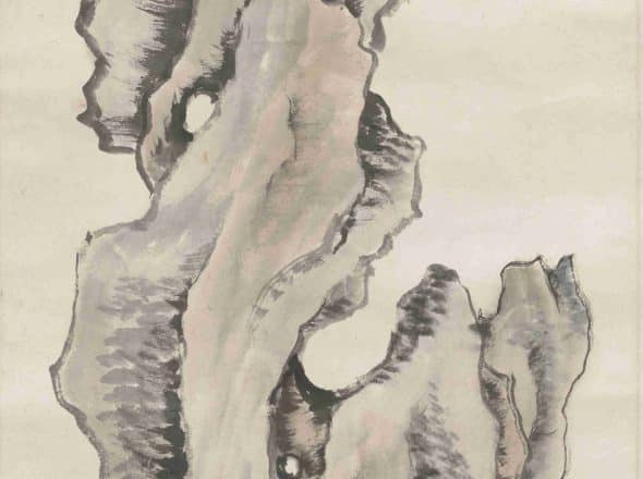 This scroll depicts a lake stone with vigorous brushwork, simple yet artistically refined. The few strokes used to outline and render the stone convey its delicate, multi-layered appearance. The inscription reads: "Though lofty, the peak resembles a small hill. Within a short distance lies a thousand miles. The bushy osmanthus invites seclusion, Huainan seems far away. Washing stones and resting by the stream, Zijing may arise. How extraordinary is the calm longevity, being benevolent ceaselessly. I engrave this testament, the way is close at hand. By Lazy Cloud." The seals read "Yunlou's calligraphy and painting" and "The old house of Xichou," with the additional seal "Lazy Cloud's painting seal" at the lower left.