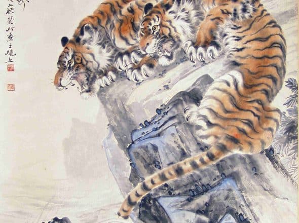 This early work by Cai Heting vividly depicts two fierce tigers roaring on the bank of a rocky torrent. The tigers are rendered with dynamic postures and majestic expressions, exuding both power and vitality. Beneath the rock, waves crash forcefully, creating a sense of drama and tension that evokes the imagery of "tigers roaring and dragons singing." Although no dragon is present, the turbulent waters suggest its looming presence, enhancing the painting's mythical atmosphere.